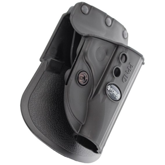 Rodzaj kabury - ND / Evolution-2 (New Design / E2 Series) - nowa generacja kabur Fobus. Wykonana z jednego kawałka tworzywa, jest lekka mimo dodatkowych funkcji. Zawiera dodatkowy pasek metalu wzmacniający nity mocujące kaburę z płetwą co poprawia jej wytrzymałość oraz niezawodność. Redukcja wagi została osiągnięta poprzez zastosowanie kilku otworów na powierzchni kabury. Kabury z serii ND / E2 posiadają dodatkową śrubę przy kabłąku umożliwiającą indywidualne dostosowanie siły docisku kabury. Regulacja ma wpływ na siłę z jaką broń jest trzymana w kaburze oraz z jaką siłą jest wyciągana z kabury. Niski profil ułatwia ukrycie broni, zwiększając komfort jej przenoszenia. Kabura dobrze zabezpiecza broń przed uszkodzeniem, nie ma tendencji do przemieszczania się. Dostępna w wersji dla praworęcznych.