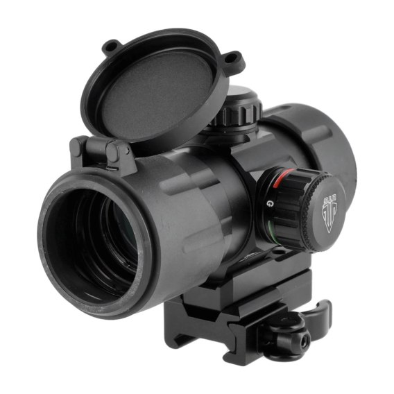Przedstawiamy Państwu kolimator Leapers DS3840 4.0'' 30 mm T-DOT. Kolimator o budowie zamkniętej charakteryzuje wysoką jakością wykonania. Tubus kolimatora został wykonany z duraluminium dzięki czemu zyskujemy pewny i skuteczny układ optyczny do Twojej jednostki broni czy też karabinku pneumatycznego. Kolimator posiada plamkę 4 MOA typu T-DOT a jej natężenie oraz kolor (czerwony i zielony) możemy zmienić płynnie za pomocą wieżyczki umiejscowionej na boku urządzenia. Firma Leapers zastosowała w produkcie wysokiej klasy soczewki, które są odporne na parowanie, dzięki czemu obraz jest jasny oraz klarowny w najbardziej wymagających warunkach. Optykę kolimatora zabezpieczają dwie gumowe zaślepki typu flip-open. Kolimator w swoim zestawie posiada montaż na 22 mm oraz podwyższenie, dzięki czemu jesteśmy w stanie zamontować go praktycznie na każdej jednostce broni posiadającej szynę picatinni. Do kolimatora pasuje bateria CR1620.