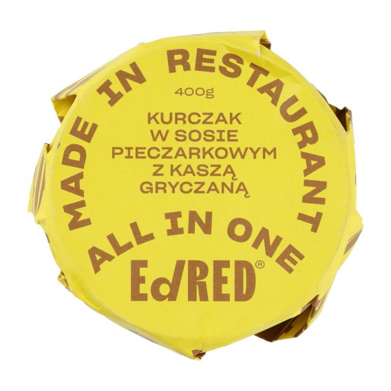 Konserwa Ed Red o smaku kurczaka w sosie pieczarkowym z kaszą gryczaną z serii ALL IN ONE to pyszne danie przygotowane wyłącznie z naturalnych składników, umieszczone w ekologicznym opakowaniu z długim terminem przydatności do spożycia.