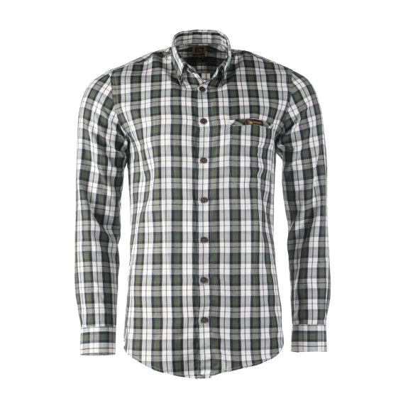 Wykonana głównie z wysokiej jakości bawełny z domieszką poliestru, oferuje wyjątkową miękkość i przewiewność, a dodatek poliestru sprawia, że jest wytrzymała, łatwa w pielęgnacji i prasowaniu. Charakterystycznym elementem koszuli jest średniej wielkości krata w odcieniach ciemnozielonego, granatowego i białego, nadająca jej wyrazisty, elegancki wygląd.