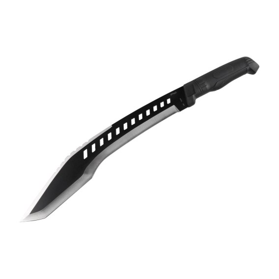 Swoim kształtem maczeta nawiązuje do tradycyjnego nepalskiego noża kukri, cenionego za ogromną wydajność i uniwersalność zastosowań. Środek ciężkości został przesunięty do przodu, dzięki czemu w rąbanie i cięcie maczetą wkładamy znacznie mniej energii. Taktyczny charakter podkreśla czarne antykorozyjne pokrycie głowni oraz agresywna karbowana linia grzbietu.