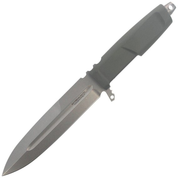Głownia - masywna o nowoczesnym profilu Spearhead (grot włóczni) z geometrią w kształcie rombu. Klingę wykończona metodą Stone Washed. Ostrze gładkie Plain wyprowadzono wysokim szlifem płaskim (Flat grind). Wysoki szlif zapewnia doskonałą geometrię krawędzi tnącej, a fałszywe ostrze ułatwia penetrację. Lower guard jednostronny dolny stalowy jelec / osłona chroniąca dłoń przed zsunięciem się na ostrze oraz upper jimping, karbowany fragment grzbietu głowni pod kciuk ułatwiają bezpieczne trzymanie podczas precyzyjnych zadań.