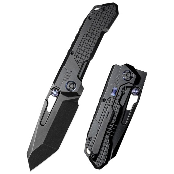 Głownia - o profilu reverse tanto została zaprojektowana z naciskiem na wzmocnienie strefy czubka oraz wysoką stabilność podczas pracy pod obciążeniem. Zastosowany szlif płaski zapewnia równomierne rozłożenie oporów cięcia na całej długości krawędzi tnącej. Powierzchnia ostrza została wykończona metodą Plating Black Titanium + Stonewashed, podkreślającą techniczną estetykę noża. Mechanizm otwierania oparto na łożyskach kulkowych, co zapewnia płynną, stabilną pracę bez szarpnięć. Za blokadę odpowiada blokada Button Frame Lock, dodatkowo wsparta niezależnym zabezpieczeniem który unieruchamia element blokujący, zwiększając bezpieczeństwo podczas intensywnej pracy.
