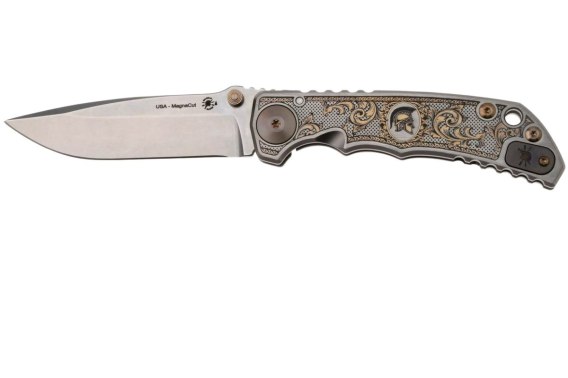 Solidna rękojeść z tytanu ozdobiona jest artystycznym grawerunkiem "Flourishes". Dzięki odpowiednio wyprofilowanemu uchwytowi nóż pewnie leży w dłoni, zapewniając precyzję podczas wykonywania różnorodnych działań. Solidny mechanizm blokujący typu frame lock gwarantuje bezpieczne użytkowanie nawet w ekstremalnych warunkach. Każdy egzemplarz jest wykonywany ręcznie w USA, co czyni go wartościowym i poszukiwanym przedmiotem zarówno wśród kolekcjonerów, jak i wymagających użytkowników.