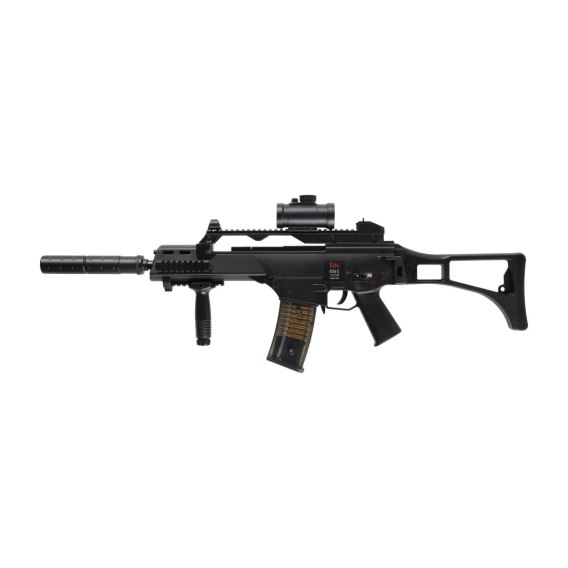 H&K G36C to elektryczna replika asg, przeznaczona dla początkujących graczy wyposażona w celownik kolimatorowy, chwyt przedni oraz atrapę tłumika dźwięku.