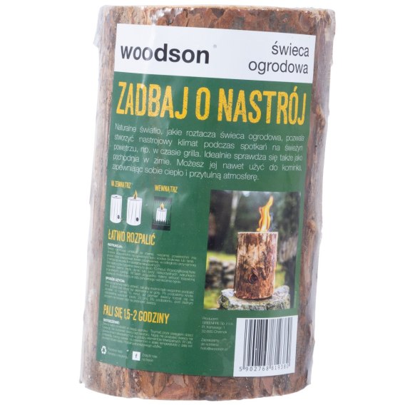Świeca ogrodowa Woodson to tradycyjna pochodnia, którą wykonuje się z suchego kawałka drewna sosnowego. Do rozpalenia ognia pieniek wykorzystuje knot umieszczony w specjalnie wydrążonym kanale. Sosnowy pieniek pali się od 90 do 120 minut (zależności od wilgotności powietrza i wiatru), wydzielając dużo światła i ciepła.