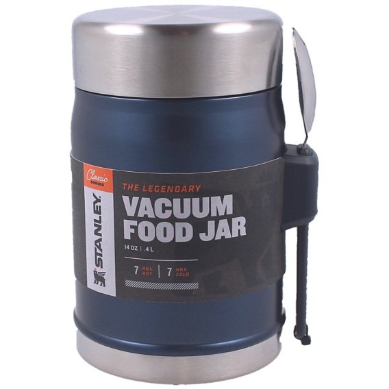 Kompaktowy termos obiadowy ze sztućcem Stanley Classic Vacum Food Jar .4L Nightfall. Opatentowana technologia próżniowa utrzymuje temperaturę posiłków gorących przez 7 h, zimnych 7 h. Stal nierdzewna 18/8, wolny od BPA. Otwieranie wlewu przyciskiem