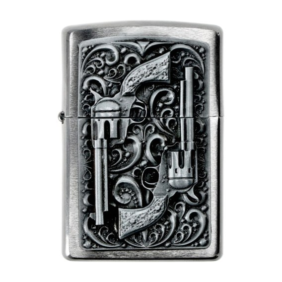 Zapalniczka benzynowa Zippo to prawdziwa ikona wśród tego typu urządzeń, będąca wręcz synonimem zasilanego benzyną modelu. Wysoka niezawodność, doskonała jakość wykonania oraz skuteczne zabezpieczenie płomienia przed wiatrem sprawiają, że zapalniczki Zippo cieszą się niesłabnącą popularnością od czasów Drugiej Wojny Światowej, kiedy to służyły amerykańskim żołnierzom w trudnych warunkach walk na Pacyfiku. Już teraz możesz skorzystać z nieocenionych zalet tego ikonicznego produktu w wersji wizualnej, która będzie najlepiej wyrażała Twoją osobę. Omawiany model został ozdobiony kowbojskim motywem rewolwerów.